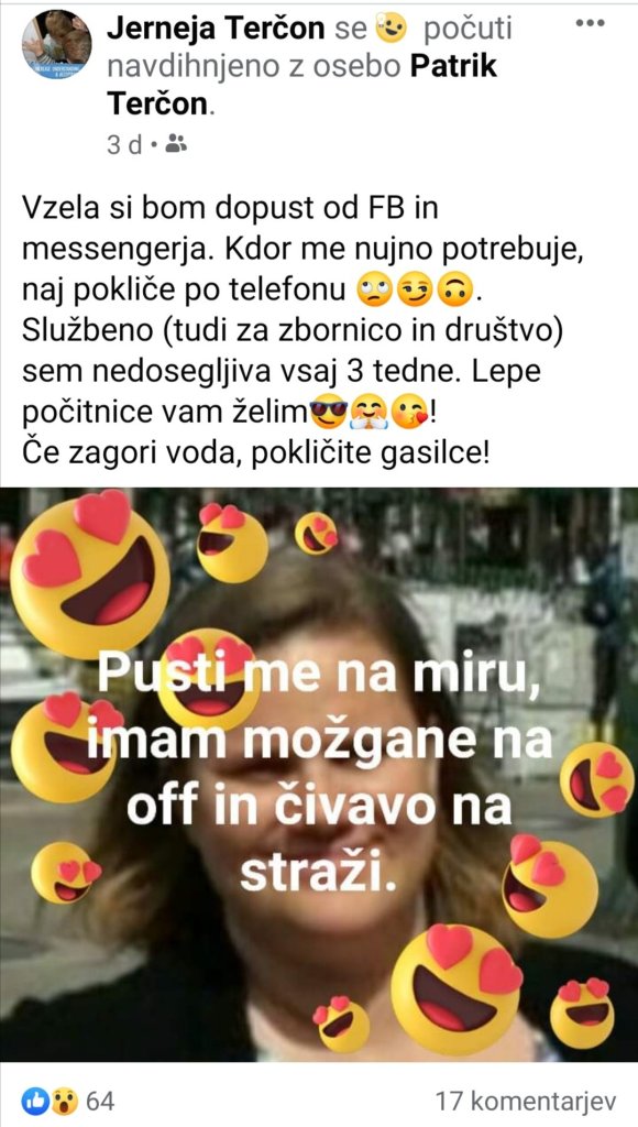 Jaz pa se tokrat ne dam. Začenjam delegirati doma, v službi, društvu in v zbornici.