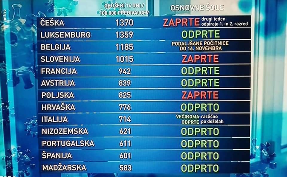 Slovenci smo poleg Poljske fenomen. Sploh glede nujnosti zapiranja šol v primerjavi z deležem okuženih na prebivalca.